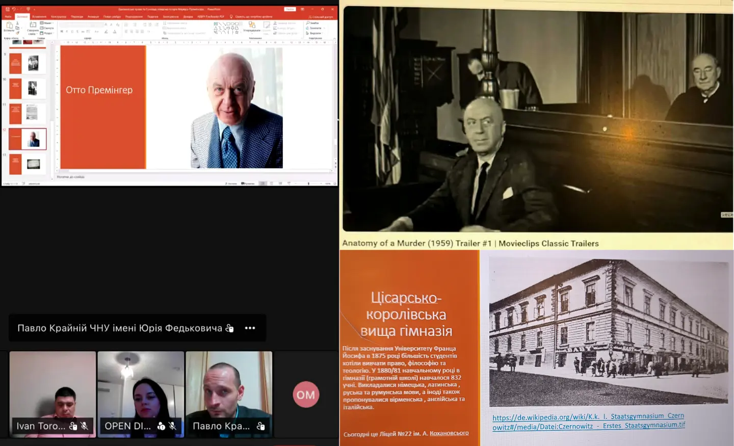 24 березня 2025 року на запрошення ГО «Open Dialogue Platform» та її засновниці Ганни Сарибаєвої – д.ю.н., доцента, доцента кафедри адміністративного та фінансового права Національного університету «Одеська юридична академія», Павлом Крайнім – к.ю.н., доцентом, доцентом кафедри публічного права юридичного факультету ЧНУ імені Юрія Федьковича, проведено публічну лекцію «Публічне право та Голлівуд: невідома історія Маркуса Премінгера».