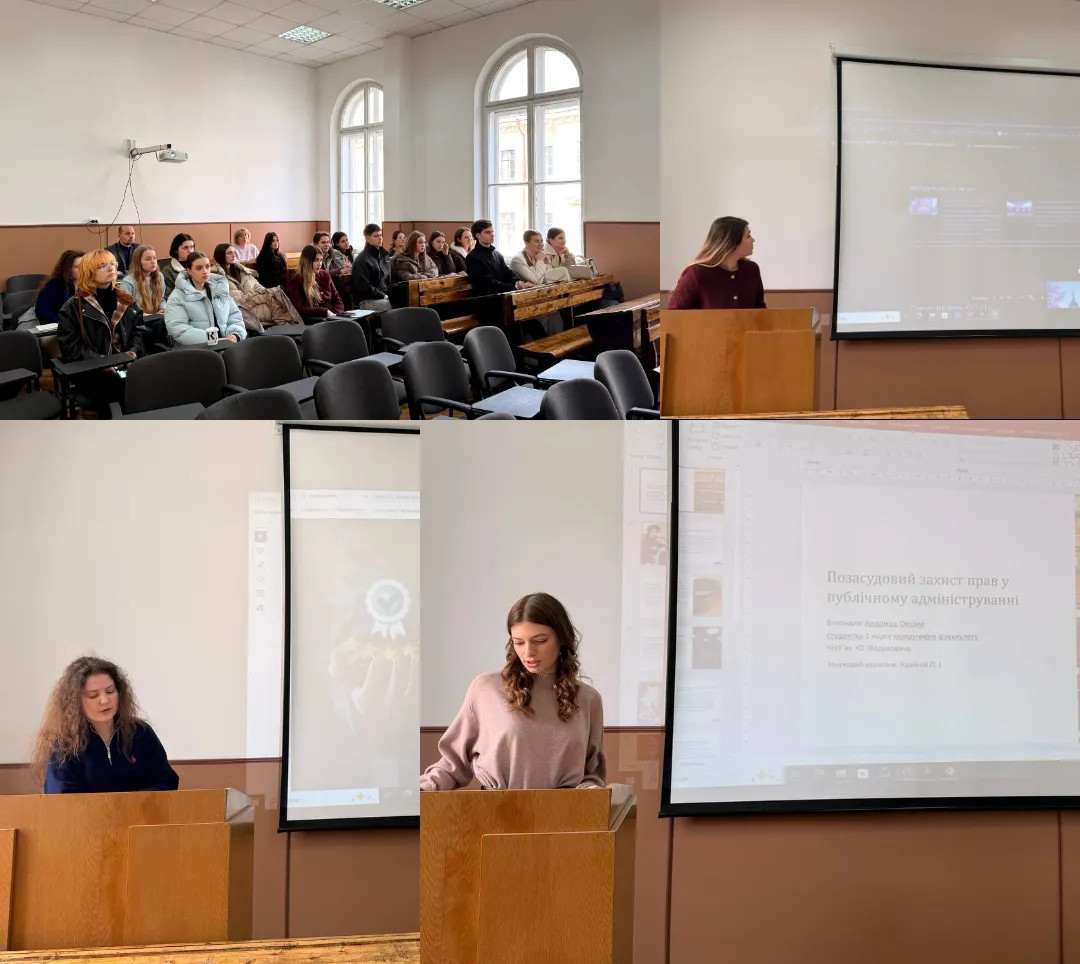 8.04.2026 року кафедрою публічного права юридичного факультету ЧНУ імені Юрія Федьковича проведено чергове засідання наукового гуртка з адміністративного права. Участь у ньому взяли студенти 1 курсу які провели наукові розвідки за окремими темами адміністративної проблематики, підготували тези конференції та здійснили публічну презентацію результатів своїх досліджень. До його проведення долучились й викладачі кафедри публічного права – наукові керівники студентів: Павло Крайній, к.ю.н., доцент, доцент кафедри та Наталія Федорук, к.ю.н., доцент, доцент кафедри.