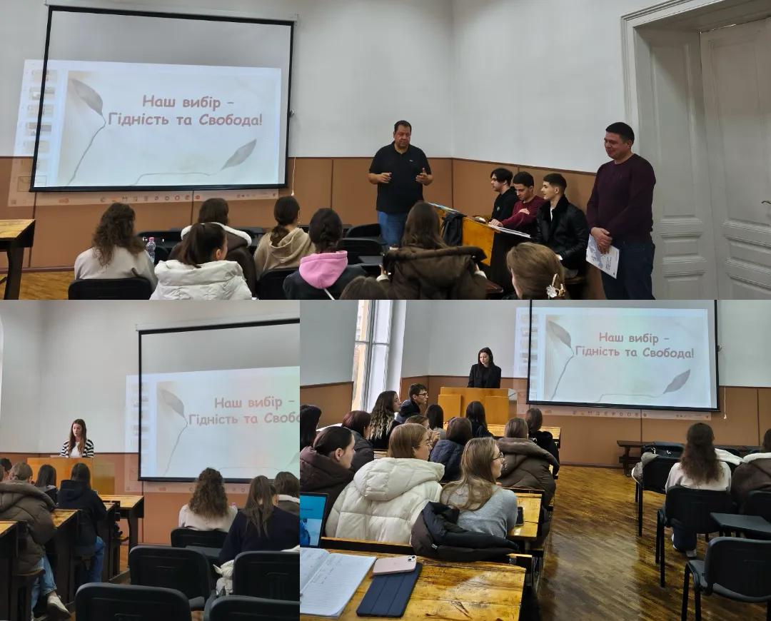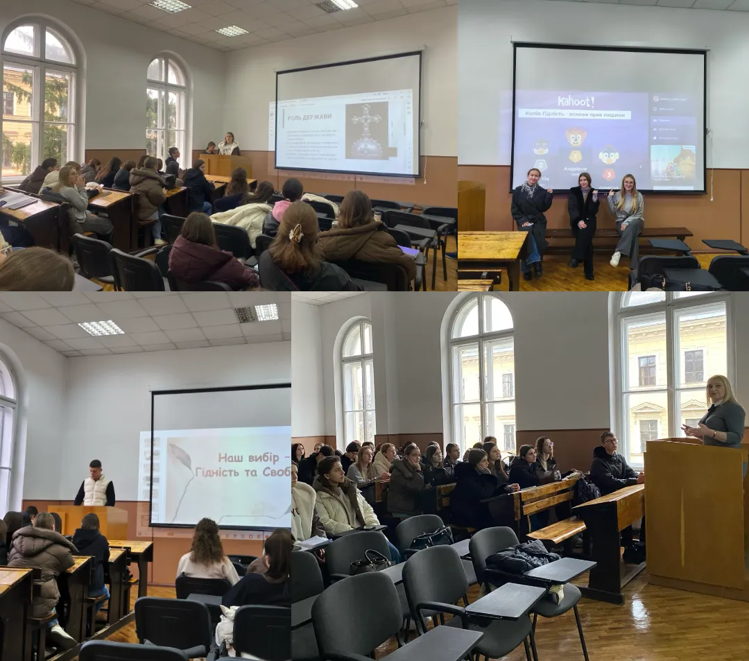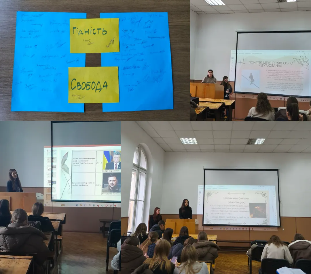 21 листопада 2025 р. на юридичному факультеті в рамках вивчення дисциплін «Теорія права» та «Права людини» проведений захід, присвячений Дню Гідності та Свободи, який став нагадуванням про цінність свободи, поваги до людської гідності та незламності українського народу. У заході взяли участь студенти першого курсу ОП «Право» та викладачі кафедри теорії права та прав людини юридичного факультету: к.ю.н., доц. Оксана Бунчук, к.ю.н., доц. Тетяна Грекул-Ковалик, к.ю.н. Ольга Миронюк.