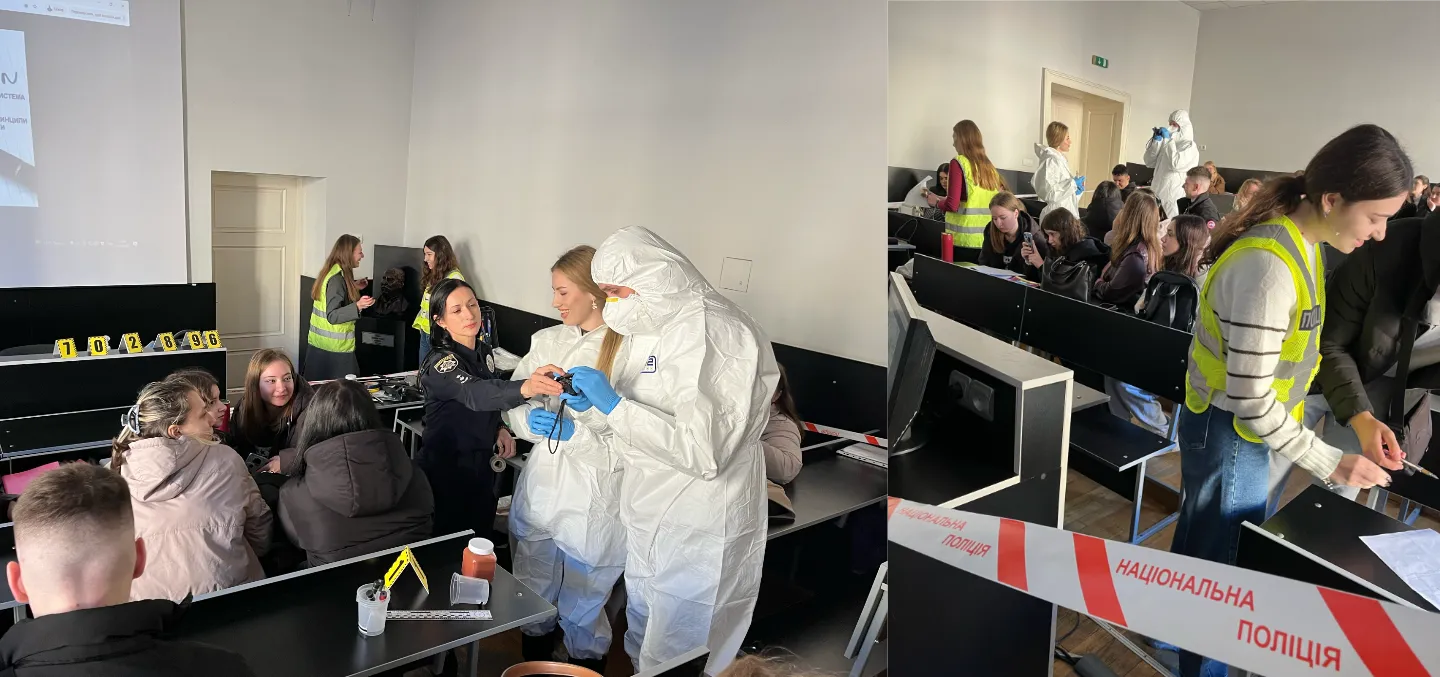 Головна мета заняття – наблизити студентів до реалій професійної діяльності криміналістів, продемонструвати практичне застосування теоретичних знань та розвинути навички аналізу, логічного мислення і командної роботи. Даний захід передбачав інтерактивну участь студентів, їм було представлено змодельовану «сцену злочину» з речовими доказами, та слідами, учасники мали змогу провести огляд місця події, зафіксувати та вилучити сліди вчинення кримінального правопорушення. Заняття супроводжувалося коментарями начальника сектору криміналістичного забезпечення, яка демонструвала сучасні методи фіксації слідів, використання технічних засобів та пояснювала особливості роботи на місці події. В наслідок чого здобувачі вищої освіти не лише поглибили знання з криміналістики, а й отримали безцінний досвід, який стане основою для їхньої майбутньої професійної діяльності.