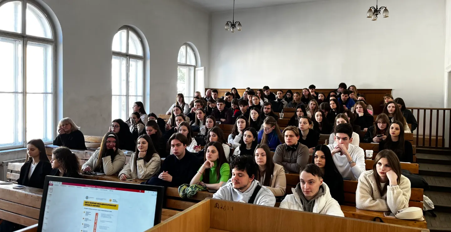 Розмова відбувалась у формі тісного взаємозв’язку лектора з аудиторією, студенти активно долучались до обговорення цікавих моментів практичного застосування норм трудового законодавства України. Серед найбільш обговорюваних питань стали роль страхового стажу; розмежування стажування та випробування у трудових відносинах; розмір штрафних санкцій за нелегальну зайнятість; особливості праці неповнолітніх; правове регулювання трудових відносин в умовах воєнного стану.